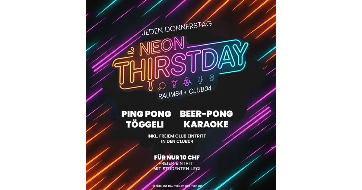 Im RAUM84 stehen Ping Pong, Töggele, Beer-Pong und Karaoke im Mittelpunkt. Hier wird gespielt, gesungen, angefeuert und angestossen – unkompliziert, gesellig und mit echtem Wettkampf-Charakter. Ob Studierende, Afterwork-Crews oder Geburtstagsrunden: Neon Thirstday ist der Treffpunkt für alle, die mehr wollen als nur einen Drink an der Bar.